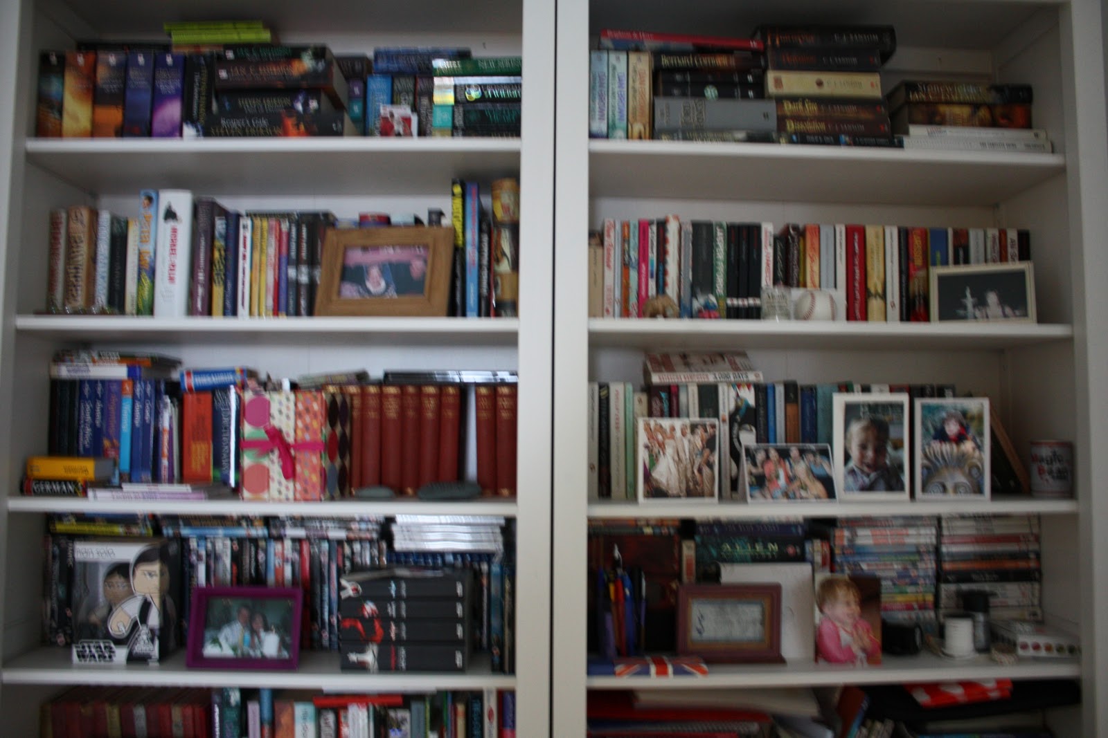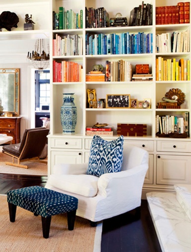 6 – Tente não preencher todas prateleiras somente com livros. Se a estante é o único lugar para isso, entendemos, mas não gostamos muito como composição decorativa. Para criar um efeito interessante você pode agrupar os livros por cor (e consegue isso muitas vezes tirando a capa sobreposta que vem na compra). As vezes é bom ter meia prateleira cheia de livros vermelhos ou meia prateleiras com livros café dispostos horizontalmente e então um quadro menor emoldurado em cima.